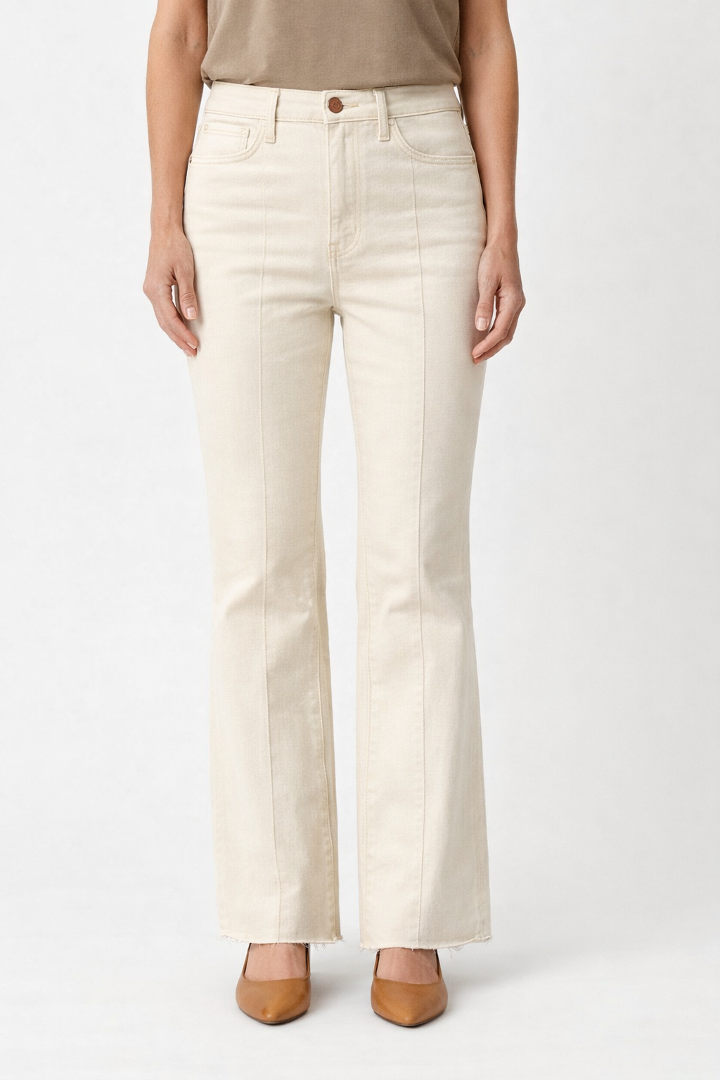 Elevated everyday style meets timeless denim with this natural high-rise bootcut jean. The classic seam down the front adds structure and definition, while the unfinished leg hem offers an effortlessly modern touch. Perfect for pairing with your favorite boots or sneakers, this versatile piece transitions seamlessly from casual weekends to dressed-up occasions. A wardrobe essential that works as hard as you do.