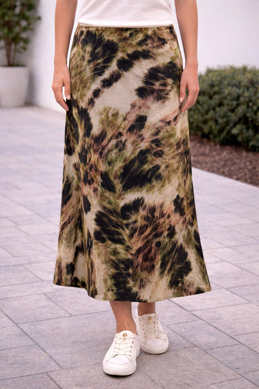 Bring an artistic touch to your wardrobe with this Watercolor Satin Midi Skirt. Its painterly blend of greens, blacks, creams, and soft earthy tones creates a beautiful, abstract look that stands out effortlessly. The silky, flowy fabric drapes beautifully with every step, giving you that easy, flattering movement we all love. Dress it up with heels and a sleek top, or make it casual with a simple tee and sneakers—this skirt does it all.