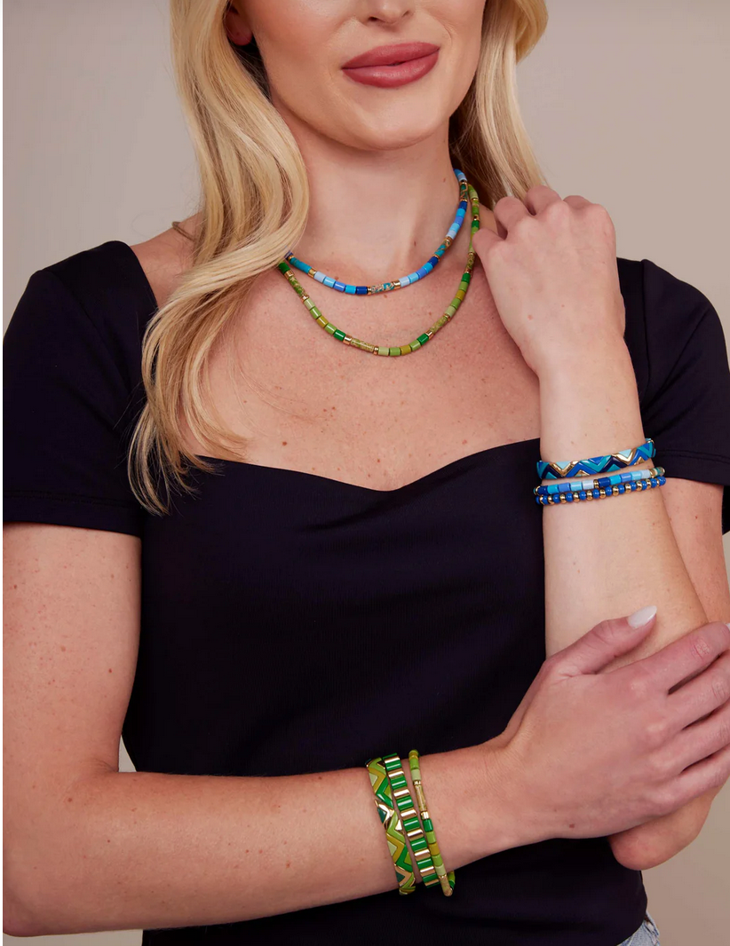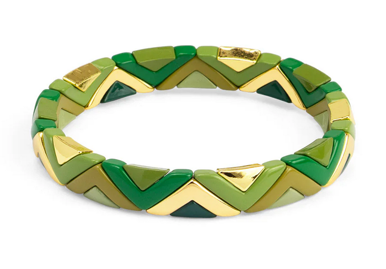 This elegant stretch bracelet features a striking chevron pattern rendered in rich green and gold enamel, creating a dynamic geometric aesthetic. The flexible design ensures a comfortable fit for any wrist, while the sophisticated color combination effortlessly transitions from casual to refined occasions. The durable enamel coating maintains its lustrous finish, making this piece a versatile addition to your jewelry collection that pairs beautifully with both everyday wear and special events.