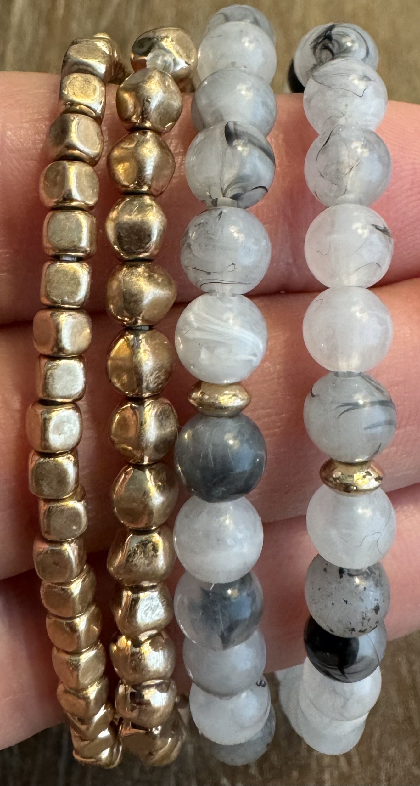 Layer your wrist with style using the Grey & Gold Stackable Bracelet set of 4. Each piece mixes neutral tones with metallic shine, offering endless combinations for casual and dressy looks. A versatile must-have for jewelry lovers.