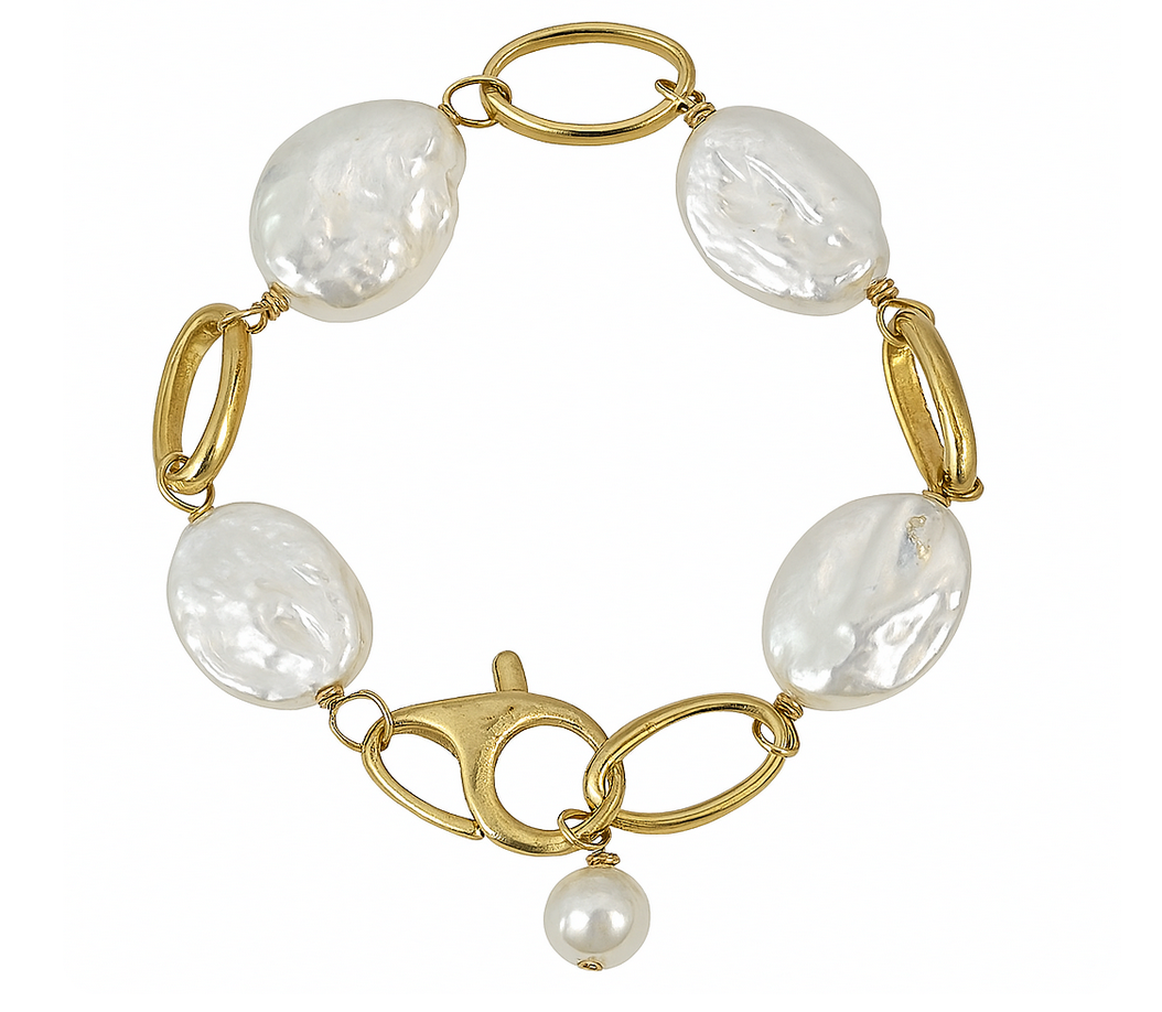 Make a statement with the Pearl & Gold Link Bracelet. Elegant and modern, it’s a versatile piece for everyday or evening wear.