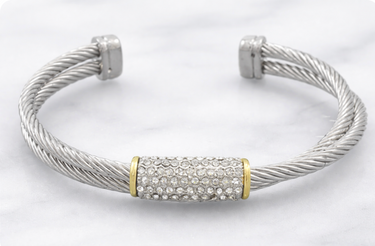 Elegant silver bracelet featuring a classic cable design paired with a stunning pavé crystal bar. The combination of textured cable links and sparkling stone detailing creates a sophisticated look that transitions seamlessly from day to night. Perfect for stacking or wearing solo, this versatile piece adds refined sparkle to any wrist. Adjustable fit ensures comfortable wear for most sizes.