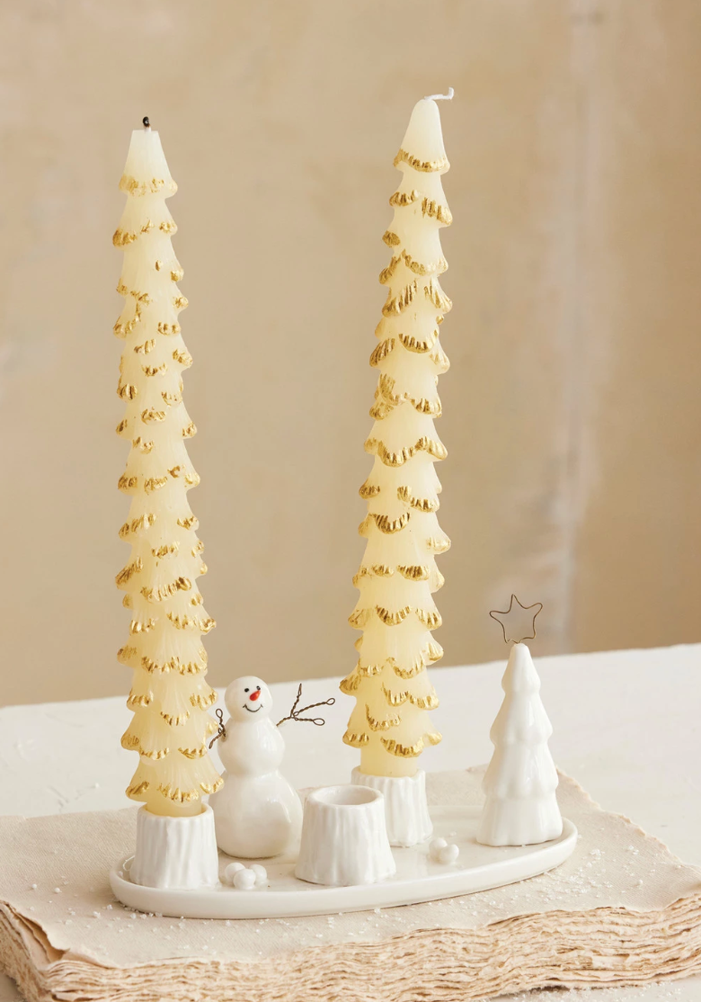 Bring festive cheer to your holiday decor with the Snowman & Tree Taper Holder. This charming piece features a cheerful snowman and a classic pine tree, perfectly designed to hold your taper candles. It adds a whimsical touch to any table or mantel, lighting up your space with a cozy, playful glow throughout the season.