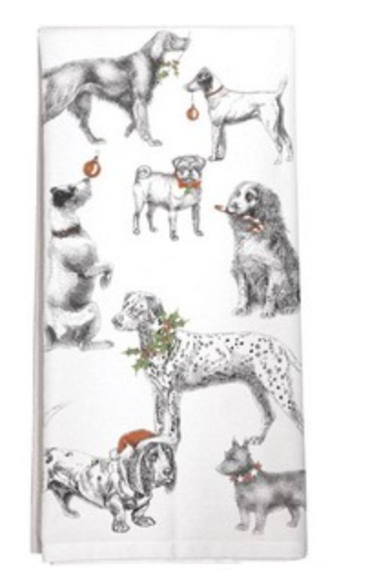 Wag-worthy kitchen style! This charming vintage-inspired tea towel features adorable holiday dogs ready to spread festive cheer. Perfect for drying dishes, wrapping gifts, or displaying on your kitchen hook, it brings whimsical holiday spirit to everyday moments. A delightful addition to your seasonal kitchen décor or a tail-wagging gift for the dog lover in your life.