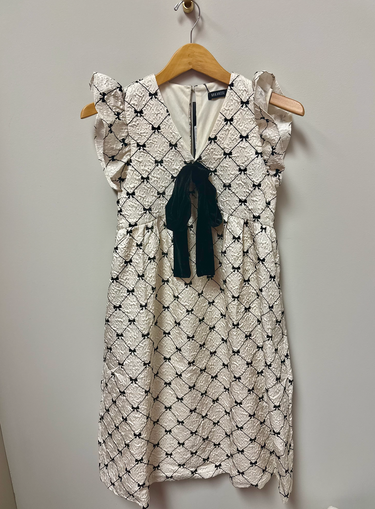 Charming, feminine, and effortlessly chic. This white textured dress is the perfect blend of classic style and playful detail. Featuring a beautiful embroidered pattern, flutter sleeves, and a flattering A-line silhouette, it’s designed to make you feel put-together with zero fuss. The standout black bow at the neckline adds a touch of contrast and sophistication—just the right amount of drama.
