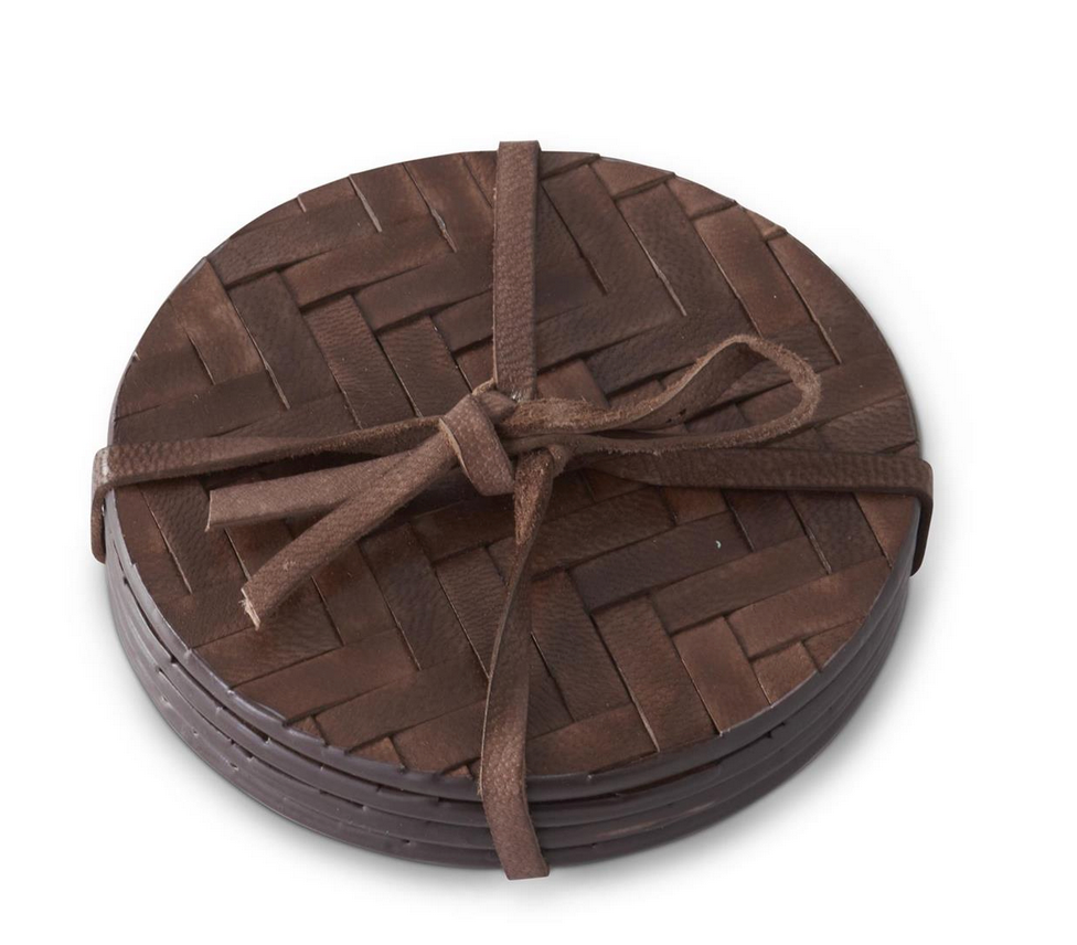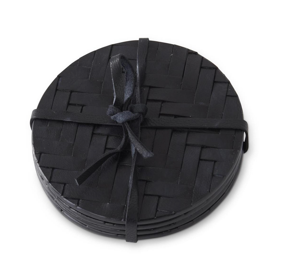 Protect your surfaces in style with Woven Leather Coasters, set of 4. Durable and chic, they bring a rustic yet refined accent to coffee tables and dining settings while keeping drinks neatly contained.