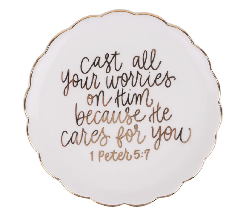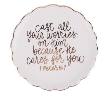 He Cares For You Trinket Tray This sophisticated 6" catchall brings elegance to your everyday essentials. Perfectly sized for jewelry, rings, and cherished keepsakes, it serves as both a functional organizer and a decorative accent. The refined design complements any décor while keeping your most treasured items beautifully displayed and within reach. An ideal addition to nightstands, vanities, or desks.