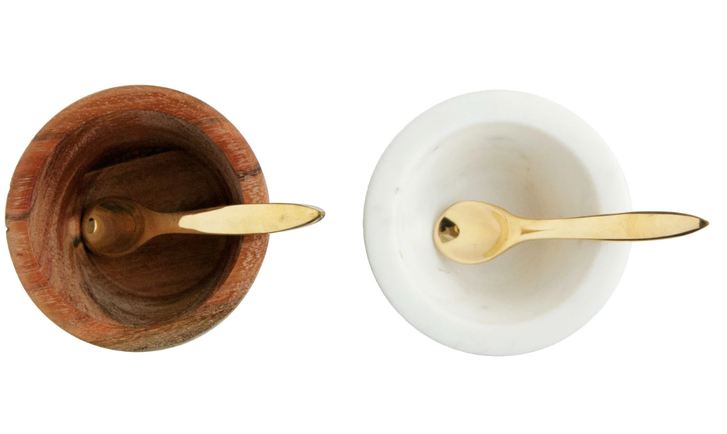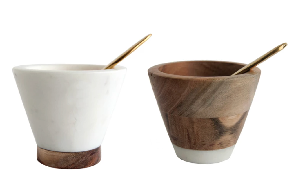 Handcrafted from natural marble and warm mango wood, this elegant pinch pot with matching spoon brings artisanal charm to your kitchen or dining table. The organic curves fit comfortably in your hand, making it perfect for serving nuts, candies, or small condiments. Each piece showcases unique veining and wood grain patterns, ensuring no two are alike. The spoon's thoughtful design complements the pot's aesthetic while remaining practical for everyday use. A versatile accent that elevates both casual meals and special gatherings with understated sophistication.