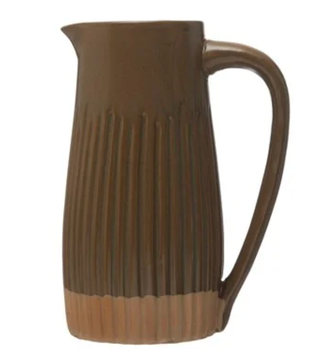 Pour with style using the Ribbed Stoneware Pitcher. Its textured surface and neutral tones make it both decorative and functional, perfect for serving drinks or displaying fresh florals in your home.