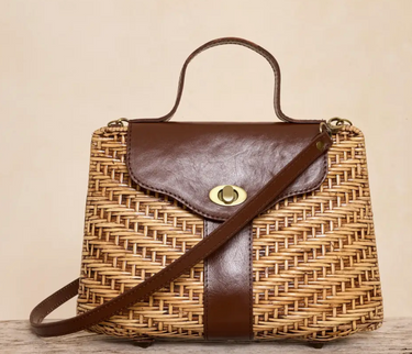 Handcrafted in Bali, this rattan handbag combines natural woven texture with rich dark leather trim for timeless style. The removable strap offers versatility—wear it as a shoulder bag or carry it by hand. Each piece is uniquely made by skilled artisans, bringing authentic craftsmanship to your everyday collection. Perfect for warm-weather outings, beach trips, or adding bohemian flair to any outfit.