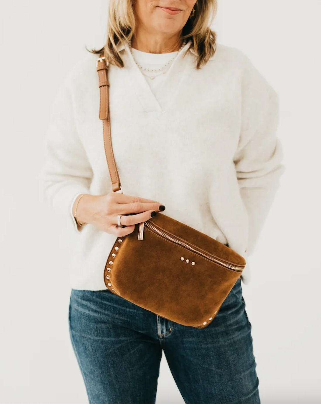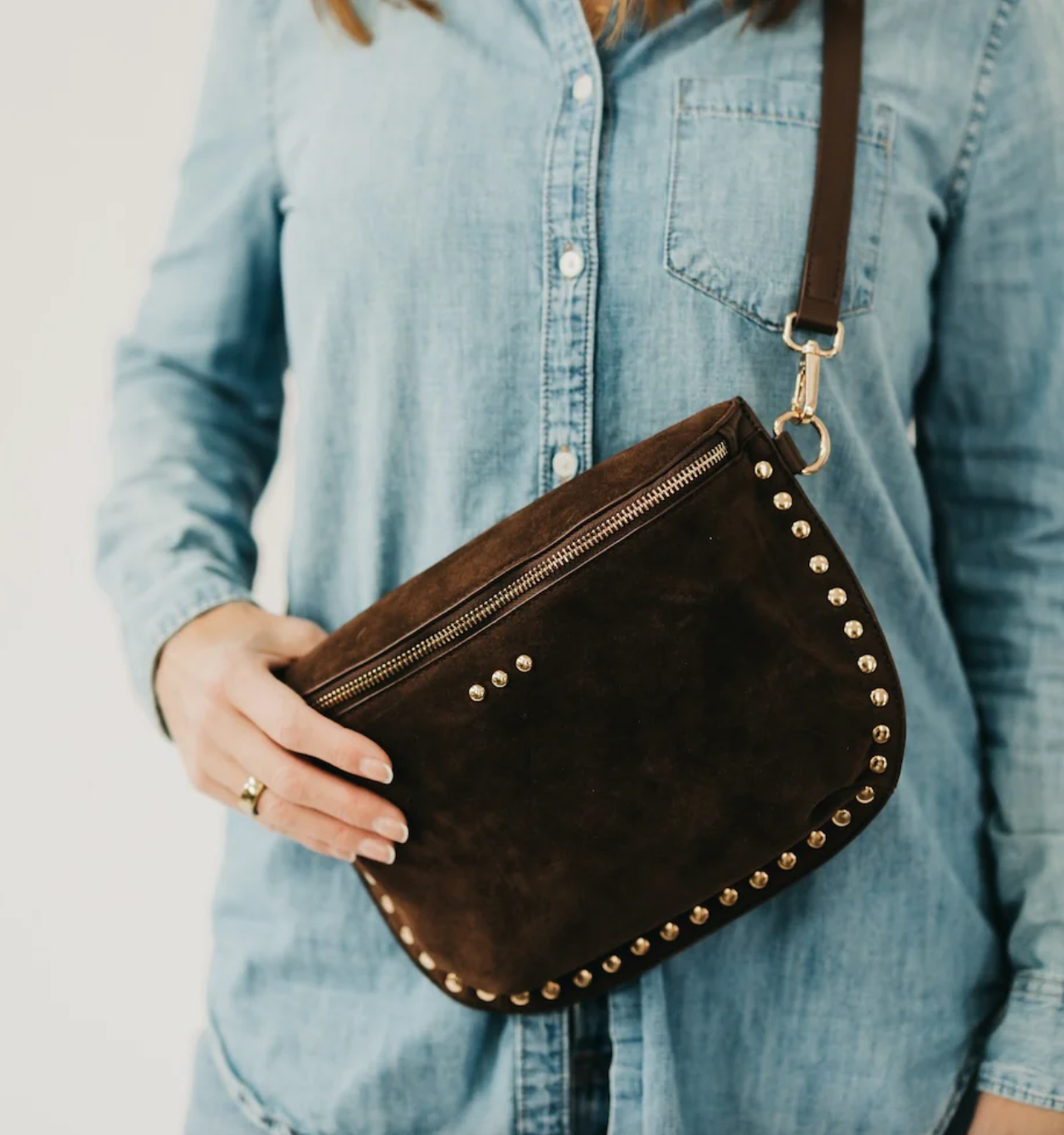 Meet the Sabrina Studded Vegan Suede Bum Bag your new go-to accessory! This playful pack combines buttery soft vegan/faux suede with eye-catching gold rivet details for a look that's equal parts chic and edgy. Choose from four stunning colors to match your vibe, and stay organized with smart interior pockets. Perfect for hands-free adventures, whether you're hitting the town or running errands. Elevate your everyday carry game!