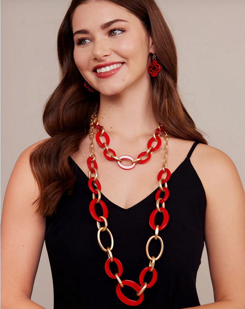 Elevate your everyday style with this striking long necklace, featuring bold oval resin links in matte gold paired with vibrant neon pink accents. The sophisticated color combination creates an effortless contrast that transitions seamlessly from day to evening wear. Perfect for layering or wearing solo, this modern piece adds contemporary flair to any wardrobe while maintaining an understated elegance.