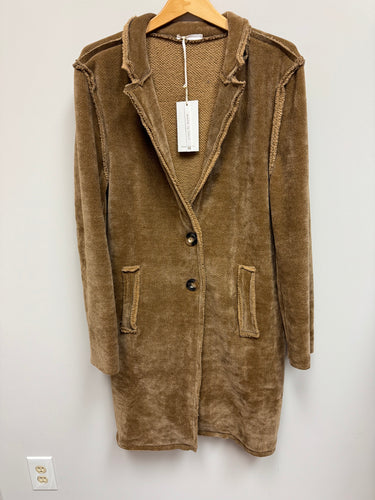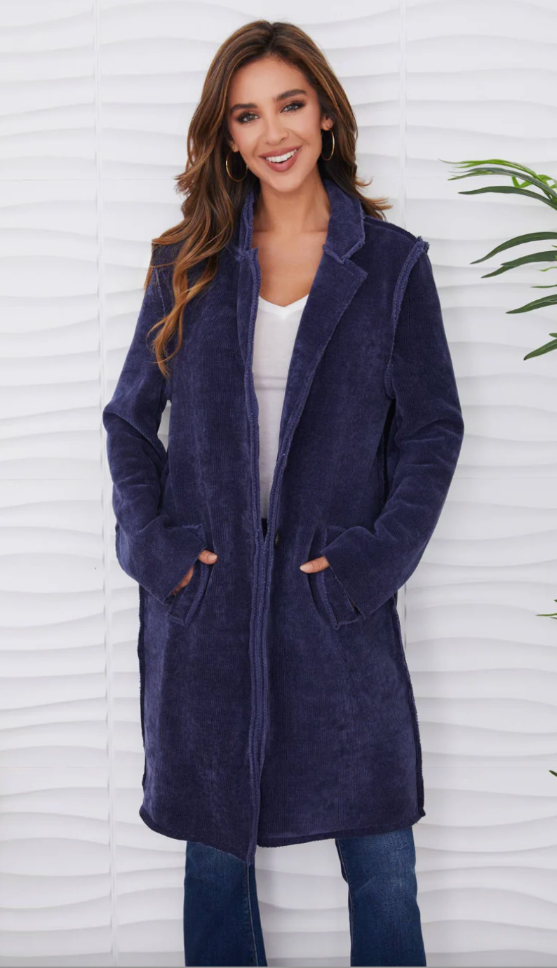 Wrap yourself in effortless comfort with this soft, textured longline corduroy coat. Designed with a relaxed, easy silhouette, it features a notched collar, raw-edge detailing, and functional front pockets for that perfect blend of casual and polished. The single-button closure makes layering simple, whether you're tossing it over denim and a tee or styling it for a night out.
