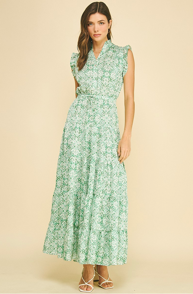 Effortless elegance meets comfort in this tiered maxi dress, featuring a soft mint meadow floral print that brings nature-inspired charm to your wardrobe. The flowing silhouette and layered design create beautiful movement with every step, while the maxi length offers versatile styling for casual outings, garden parties, or relaxed evenings. Perfect for warm weather wear, this dress pairs beautifully with sandals, sneakers, or dressy heels depending on the occasion.