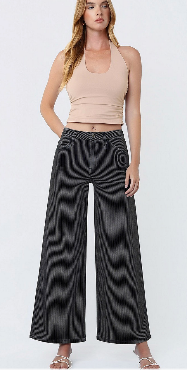 The full-length silhouette and subtle vertical stripes create a flattering, elongated look—perfect for pairing with fitted tops, breezy blouses, or cozy sweaters. A fun, fashion-forward take on denim that’s still unbelievably wearable.