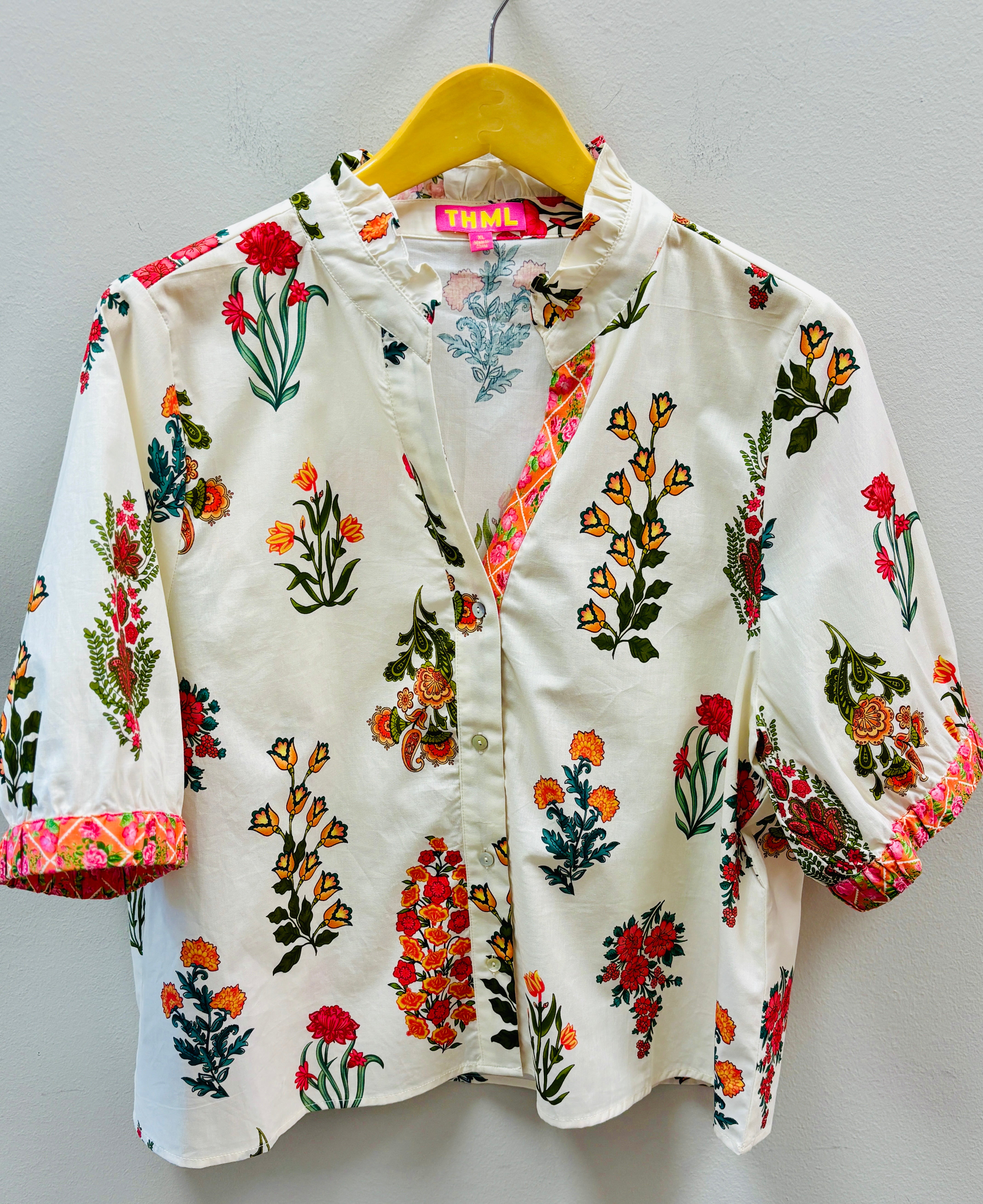 Bursting with vibrant florals and artisan-inspired detail, this THML blouse is a total standout. Designed on a soft ivory background, the colorful botanical print pops with rich reds, sunny yellows, and lush greens, giving it that effortlessly chic, boutique-favorite look. The flattering split neckline and button-front design create an easy, polished fit, while the short puff sleeves with contrast trim add a playful, feminine touch.