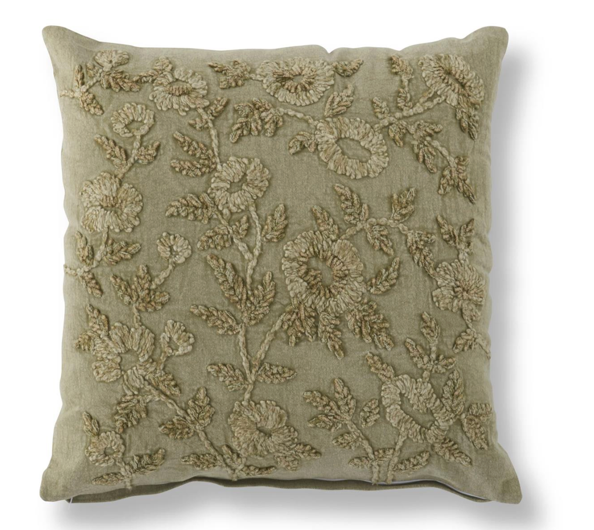 Bring natural elegance to any room with this 20" cotton pillow featuring delicate floral embroidery on a soft, stonewashed sage base. The timeless botanical design adds visual interest and warmth to your décor, while the generous size makes it perfect for layering on beds, sofas, or accent chairs. Crafted from quality cotton with a relaxed, lived-in finish, this pillow combines comfort with understated sophistication. Transform your space into a serene sanctuary that reflects your refined taste.