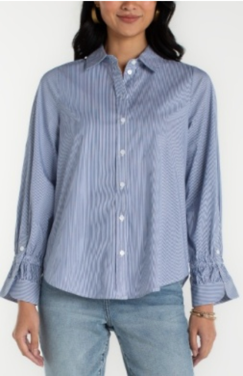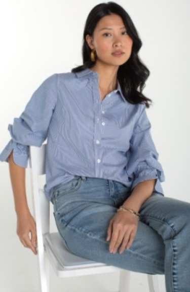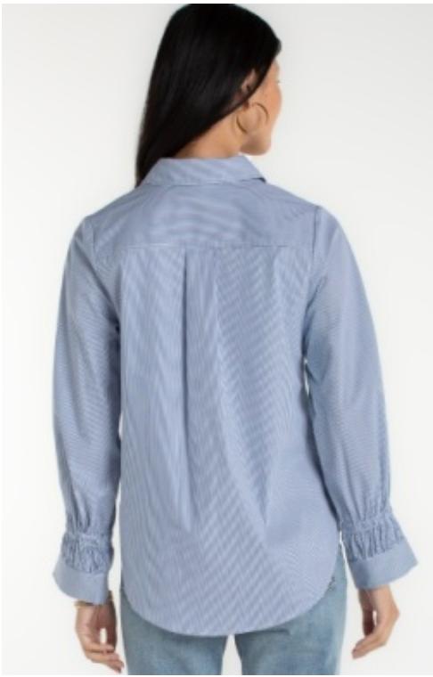 This effortless blouse is a polished staple with thoughtful details that make it anything but basic. Designed in a classic blue stripe, it features a button-front silhouette with a relaxed fit that’s easy to wear tucked or untucked. The softly gathered sleeves with subtle tie accents add a feminine touch, while the lightweight fabric keeps it comfortable all day long.