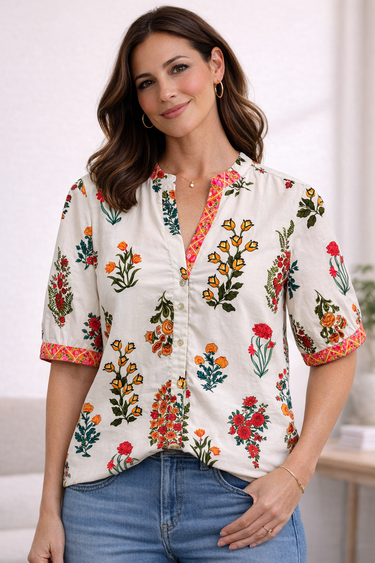 Bursting with vibrant florals and artisan-inspired detail, this THML blouse is a total standout. Designed on a soft ivory background, the colorful botanical print pops with rich reds, sunny yellows, and lush greens, giving it that effortlessly chic, boutique-favorite look. The flattering split neckline and button-front design create an easy, polished fit, while the short puff sleeves with contrast trim add a playful, feminine touch.
