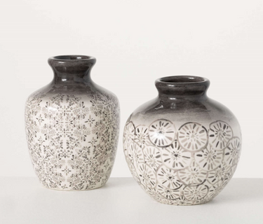 Add texture to your space with the Patterned Grey Burst Vases. Their artistic design and neutral palette complement fresh flowers or stand beautifully on their own.