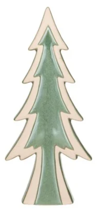 Decorate with the 13" Reactive Glaze Stoneware Frazier Tree. Its unique glaze and festive shape make it an artistic accent for seasonal displays.