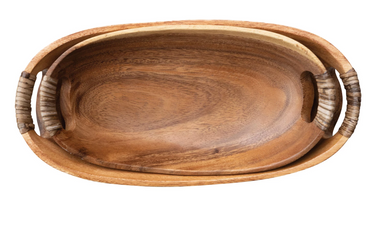 Acacia Wood Bowl w/ Rattan Wrapped Handles Large