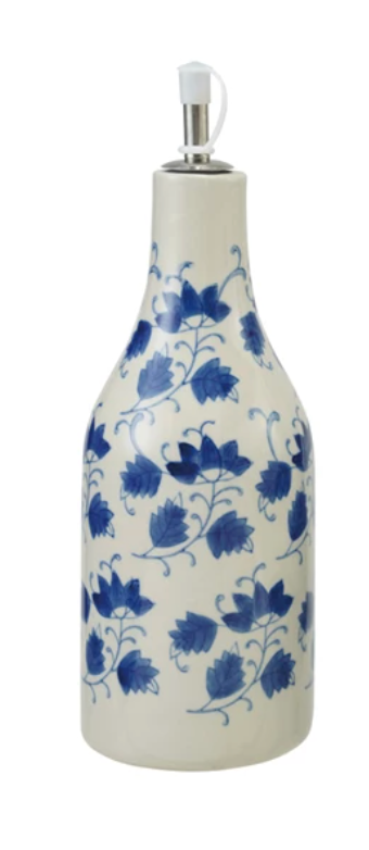 Add a touch of vintage charm to your kitchen with this handcrafted stoneware oil cruet. Featuring a delicate blue and white floral design, this 6" to 8-1/4" tall vessel is as beautiful as it is practical. The stainless steel spout delivers controlled pouring for oils, vinegars, and dressings, while the fitted plastic cover keeps your ingredients fresh and protected. Choose from two distinct styles to match your décor and personality. A timeless addition that transforms everyday cooking into a more intentional, aesthetically pleasing ritual.