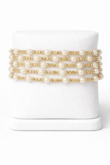 The Lily Pearl Bracelet by Meghan Browne is a timeless, feminine piece designed with effortless elegance in mind. Featuring multiple strands of luminous pearls accented with delicate gold beads, it offers a soft, layered look that’s both classic and modern. Perfect for everyday wear or special occasions, this bracelet adds a refined touch to any outfit.