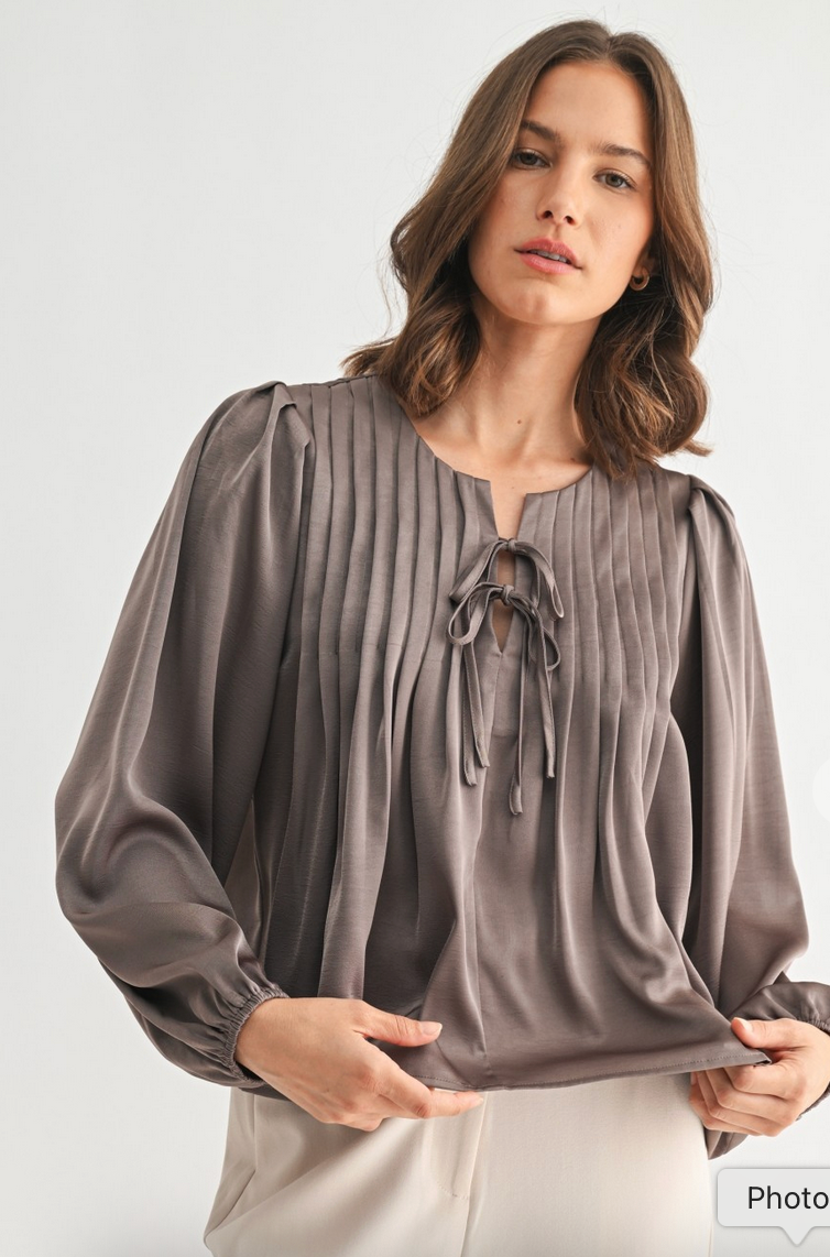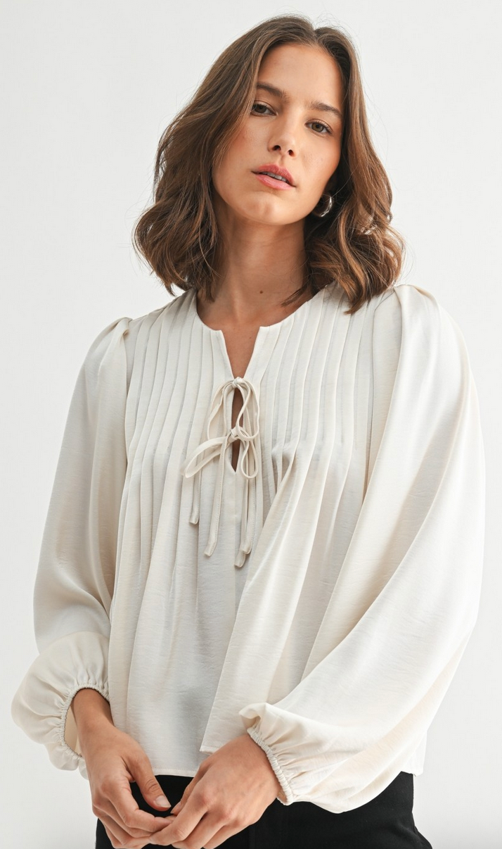 Feminine and effortlessly elegant, this pleated tie-front top features delicate vertical pleating along the neckline and a softly draped silhouette that flatters with ease. The adjustable tie detail adds a subtle touch of charm, while the long sleeves with gentle cuffs create a polished, airy feel.