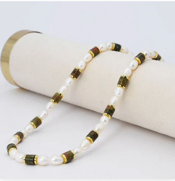 Elevate your everyday style with this simply chic gemstone necklace, where lustrous olive pearls meet warm gold accents for an effortlessly sophisticated look. The pearl mix creates beautiful depth and movement, while delicate gold touches add just the right amount of sparkle. Perfect for layering or wearing solo, this versatile piece transitions seamlessly from casual coffee dates to evening outings. A timeless addition to any jewelry collection that feels both polished and playfully elegant.